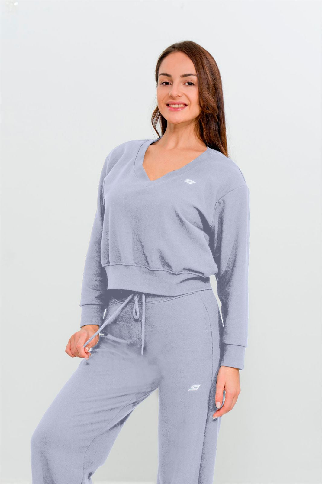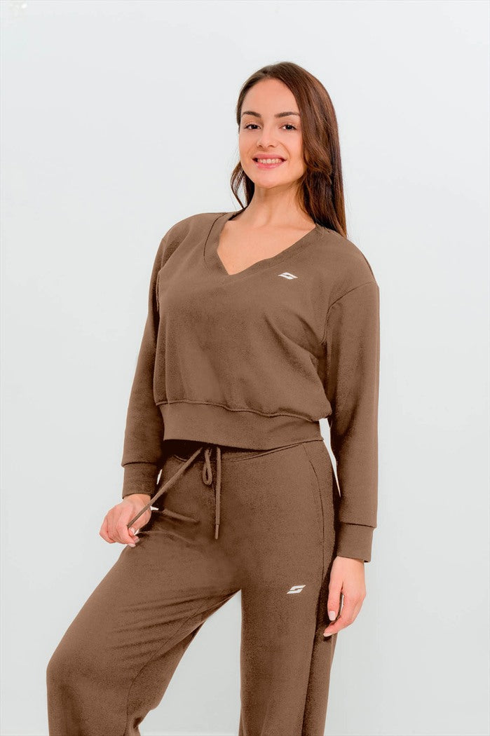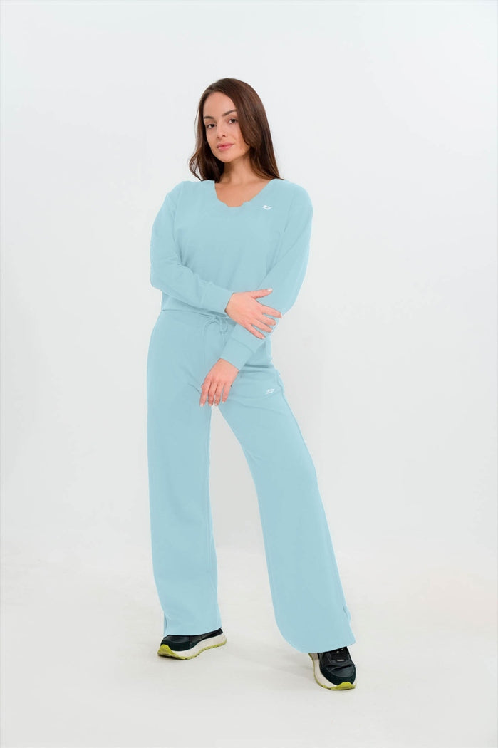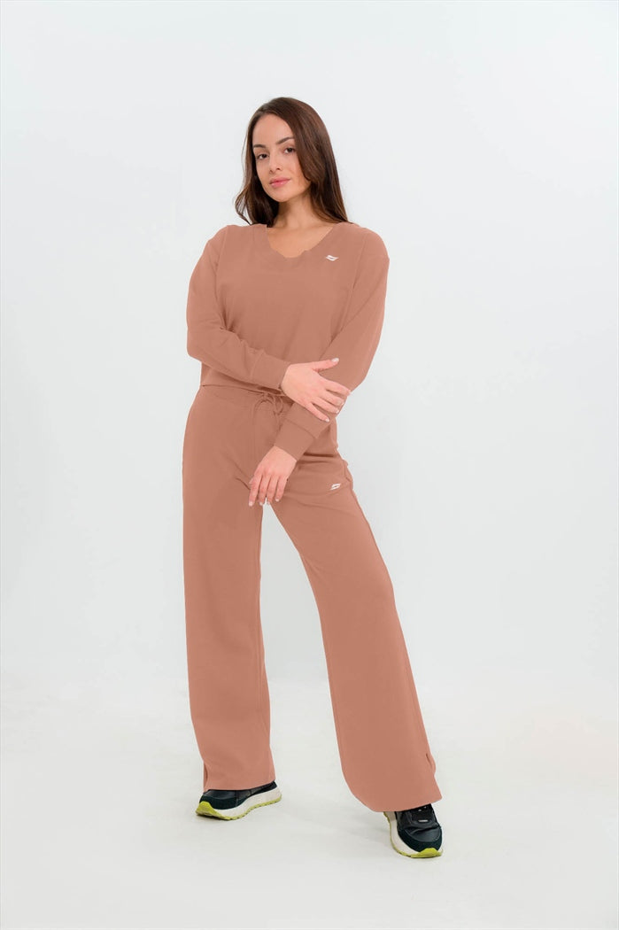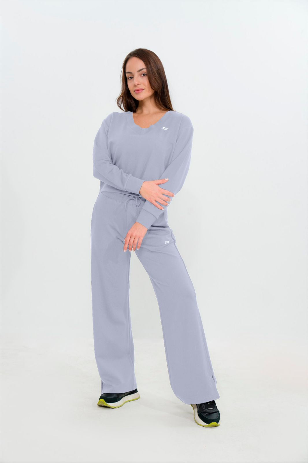 Уникален дамски модел спортен екип. Горната част на екипа е блуза с дълъг ръкав. V-образното деколте придава модерен и интересен акцент, а дългият ръкав прибавя комфорт и е подходящ за по-хладни дни. Долнището е с права кройка, която подчертава фигурата на тялото. Материята пада тежко и допринася с издължаване на силуета. На талията е прикрепен стилен кола, подсилен с връзки. В предната част на долнището има два джоба, без цип. Предлага се в няколко униклани цвята. Избери своя и поръчай !