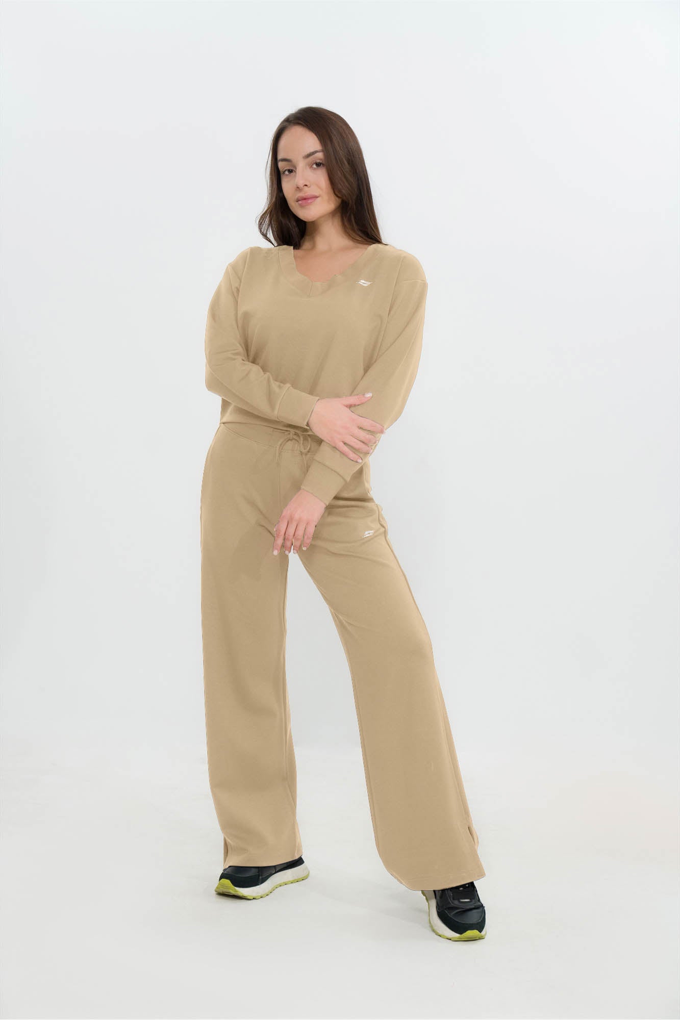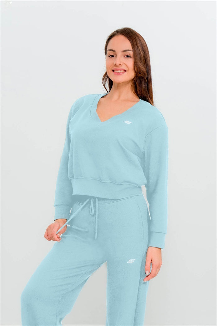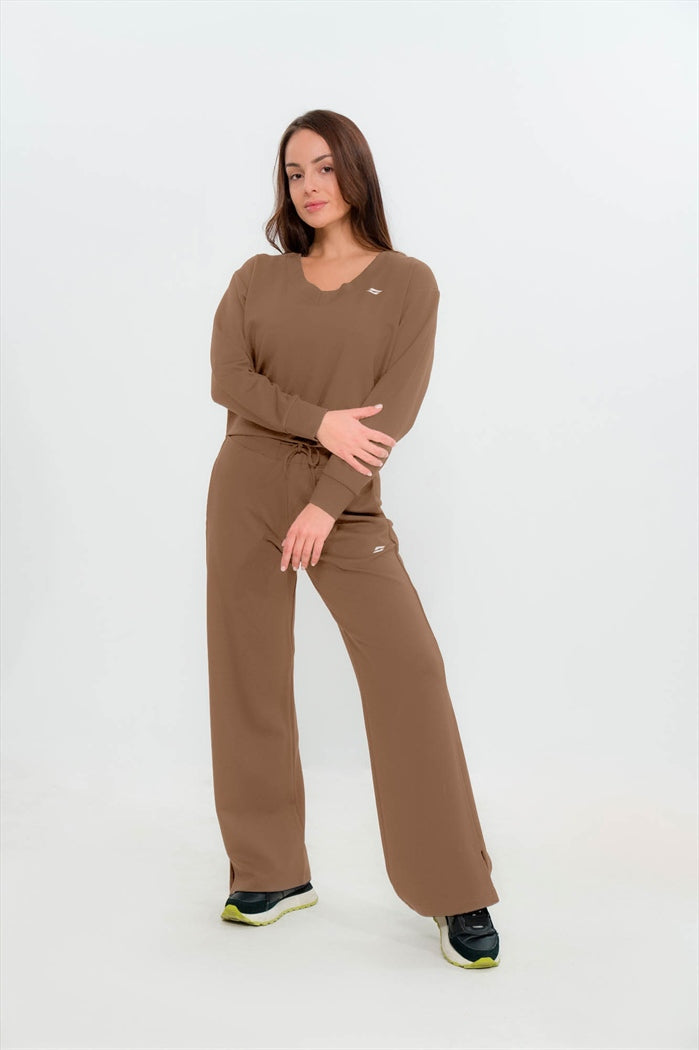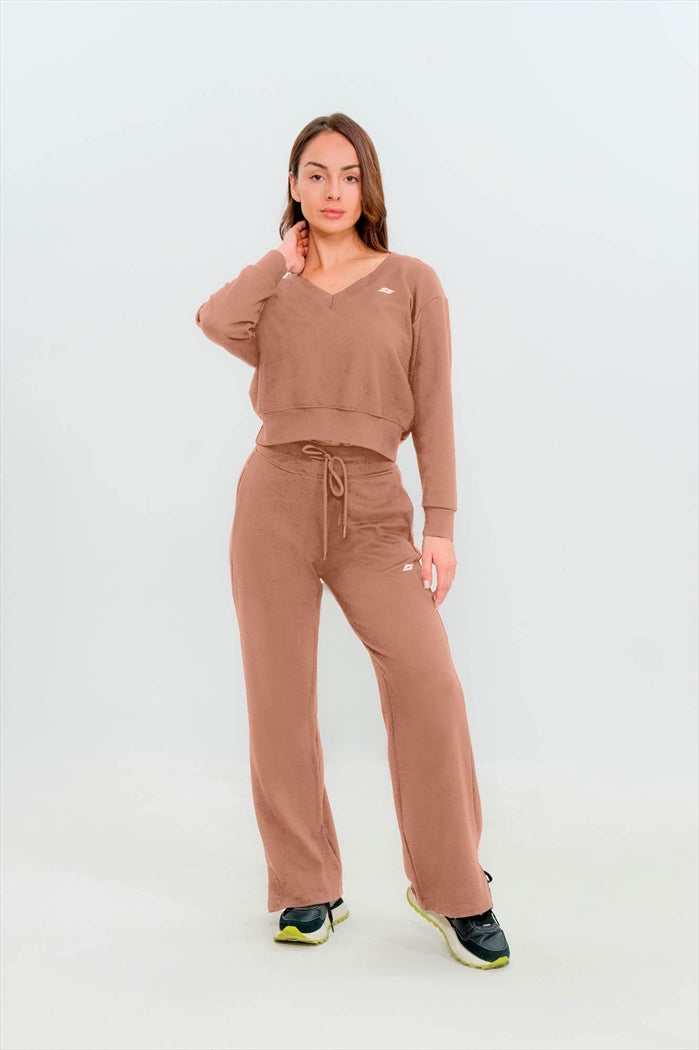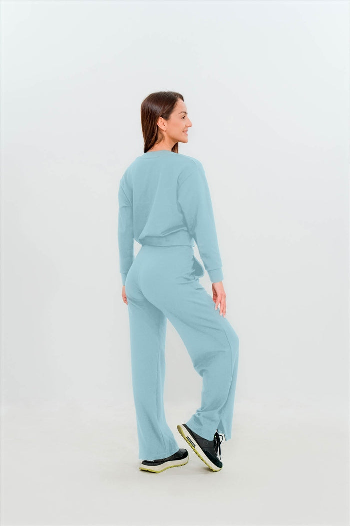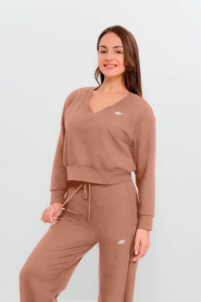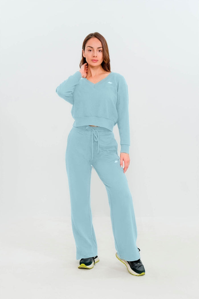 Уникален дамски модел спортен екип. Горната част на екипа е блуза с дълъг ръкав. V-образното деколте придава модерен и интересен акцент, а дългият ръкав прибавя комфорт и е подходящ за по-хладни дни. Долнището е с права кройка, която подчертава фигурата на тялото. Материята пада тежко и допринася с издължаване на силуета. На талията е прикрепен стилен кола, подсилен с връзки. В предната част на долнището има два джоба, без цип. Предлага се в няколко униклани цвята. Избери своя и поръчай !
