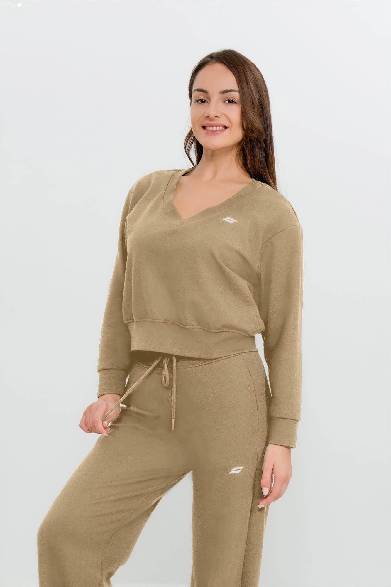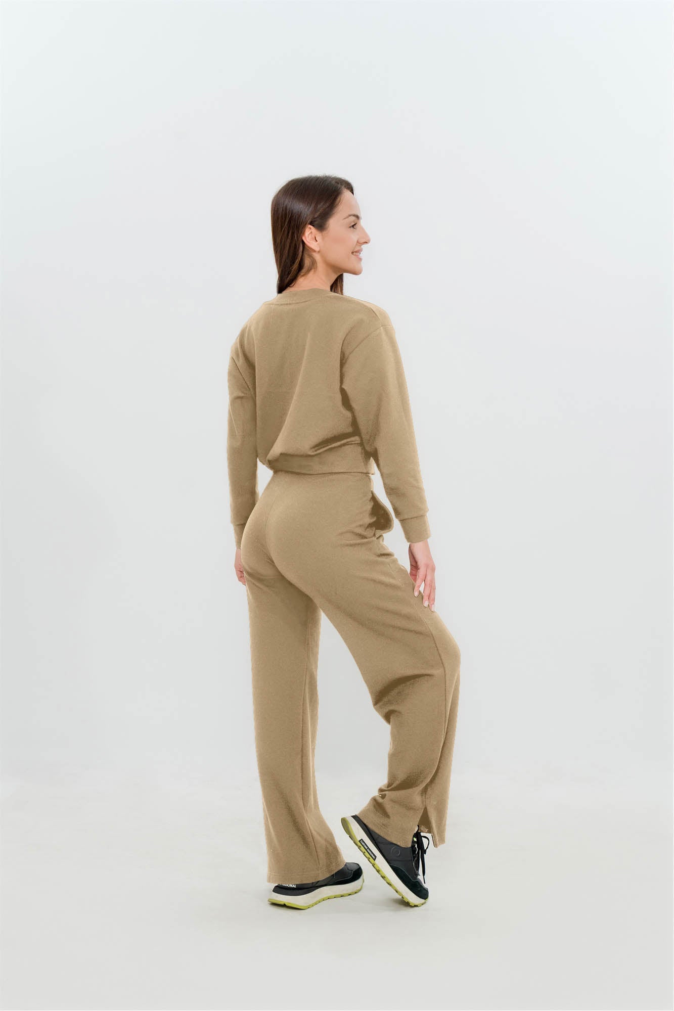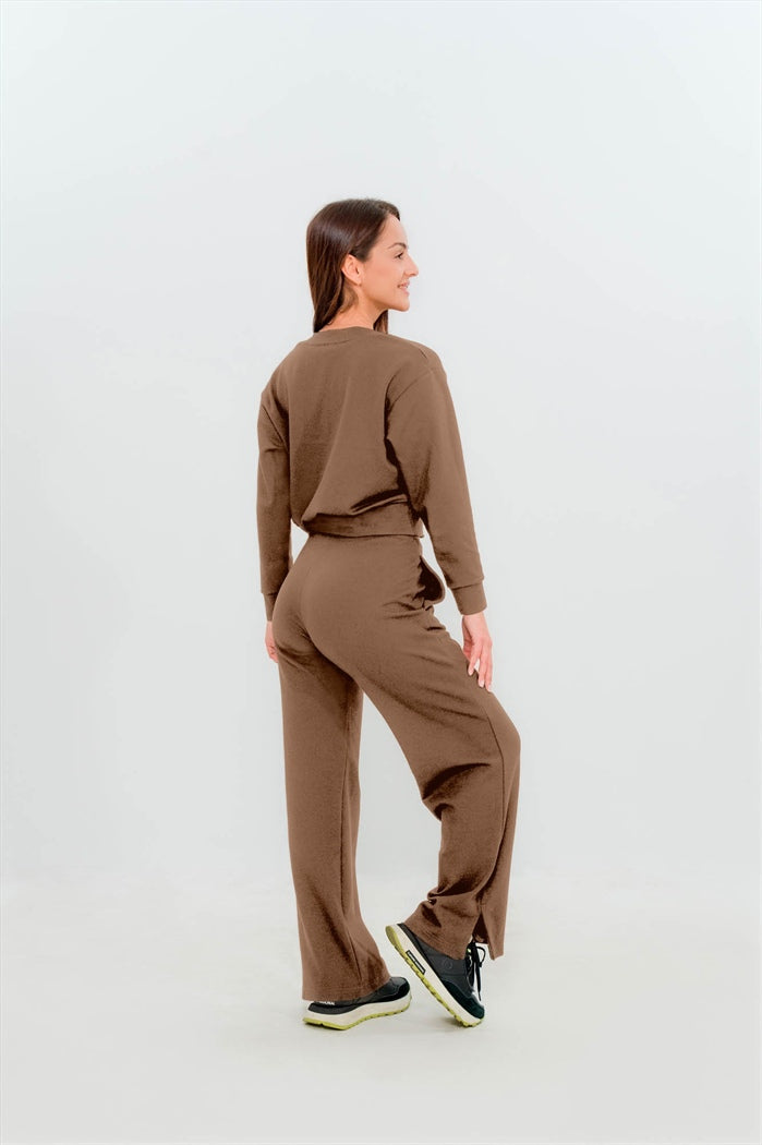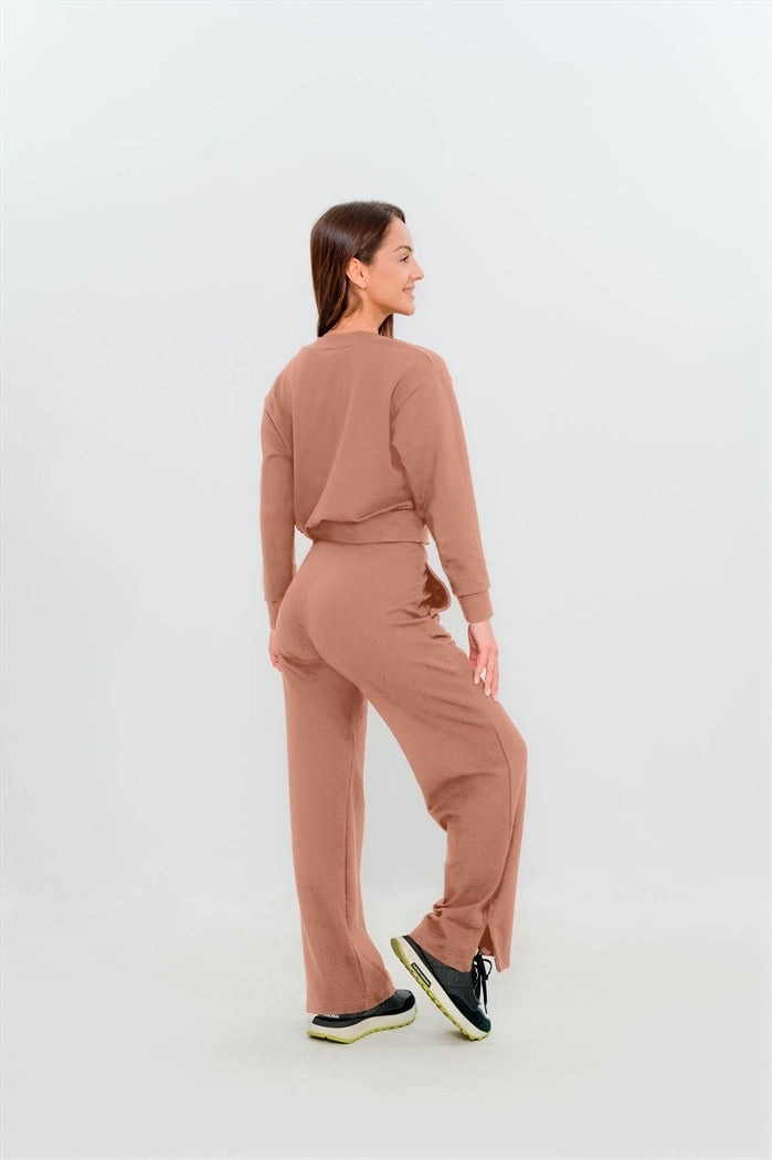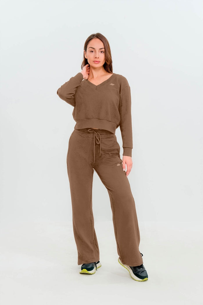 Уникален дамски модел спортен екип. Горната част на екипа е блуза с дълъг ръкав. V-образното деколте придава модерен и интересен акцент, а дългият ръкав прибавя комфорт и е подходящ за по-хладни дни. Долнището е с права кройка, която подчертава фигурата на тялото. Материята пада тежко и допринася с издължаване на силуета. На талията е прикрепен стилен кола, подсилен с връзки. В предната част на долнището има два джоба, без цип. Предлага се в няколко униклани цвята. Избери своя и поръчай !
